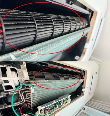 설정 온도를 낮추고 강풍으로 틀어도 예전만큼 시원하지 않거나, 지난해보다 전기요금이 비정상적으로 높게 나온다면 열교환기와 송풍팬에 먼지가 두껍게 쌓여 공기 순환을 방해하고 있는 것입니다.